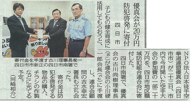 四日市地区職域防犯組合連合会様に寄付 2012年08月24日 不撓心カップ2012開催にあたり皆様方からたくさんのご協力を頂きましてありがとうございました。今回、ご協力頂きました一部を社会貢献の一環して今年は子供達の健全育成また防犯にお役に立てて頂ければと四日市地区職域防犯組合連合会様に¥200,961-を寄付致しました。ご協力頂きました皆様には趣旨をご理解のうえご了承いただきますようお願い申し上げます。ありがとうございました。また、この模様が中日新聞に掲載されました。 「社会貢献活動」カテゴリの最新記事 < 前の記事次の記事 >