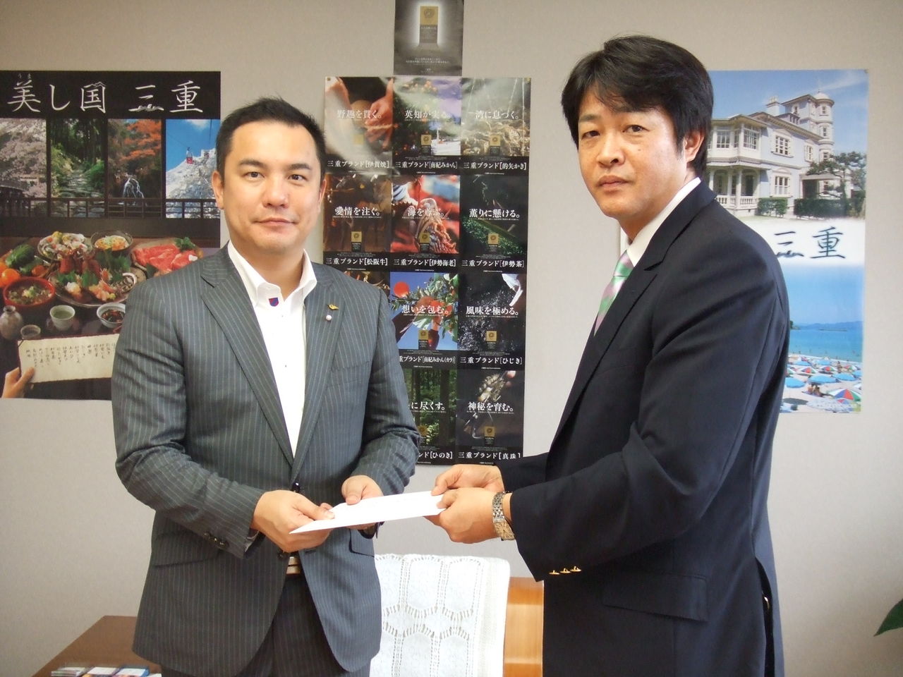 本日、当会の古川理事長が三重県庁を訪れ、8月7日に開催しました『不撓心カップ2011 空手道選手権交流大会』の収益金309,000円を東日本大震災義援金として鈴木英敬三重県知事へ手渡しました。