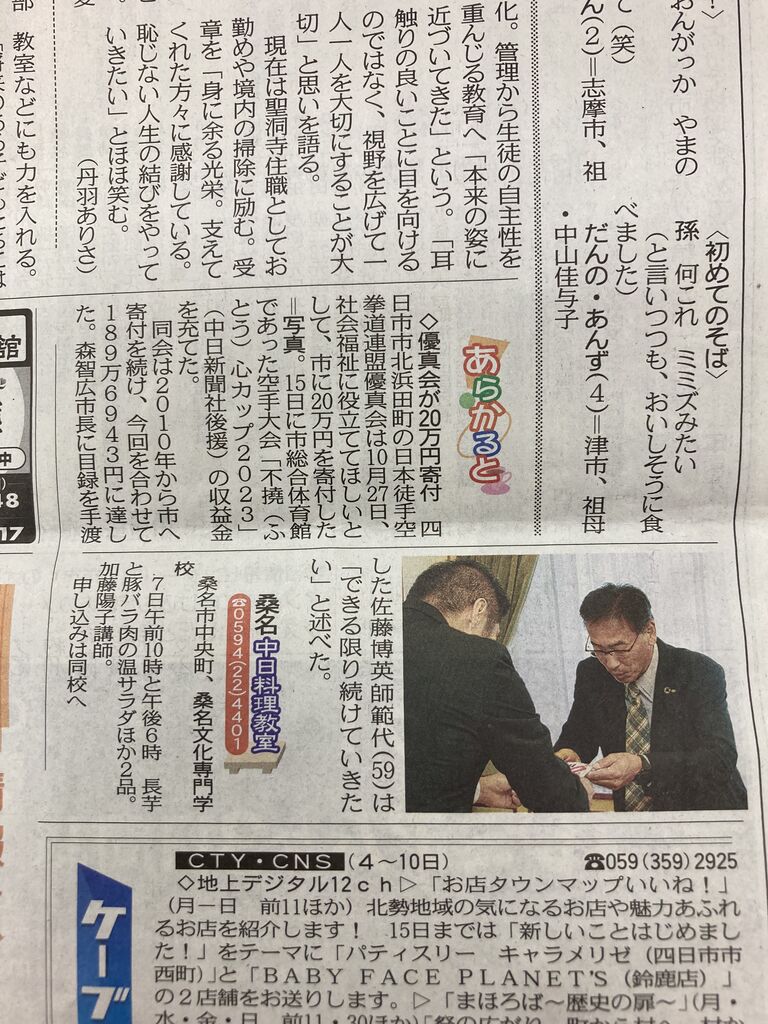 四日市市へ大会収益金を寄付。森市長からは感謝状授与。 2023年11月03日 去る10月15日(日)に開催された不撓心カップの収益金を10月27日(金)四日市市へ寄付いたしました。森市長からは感謝状をいただき、その模様は11月3日(金)付の中日新聞に掲載されました。 「不撓心カップ情報」カテゴリの最新記事 < 前の記事次の記事 > コメント コメントフォーム 名前 コメント 評価する リセット リセット 顔 星 投稿する 情報を記憶