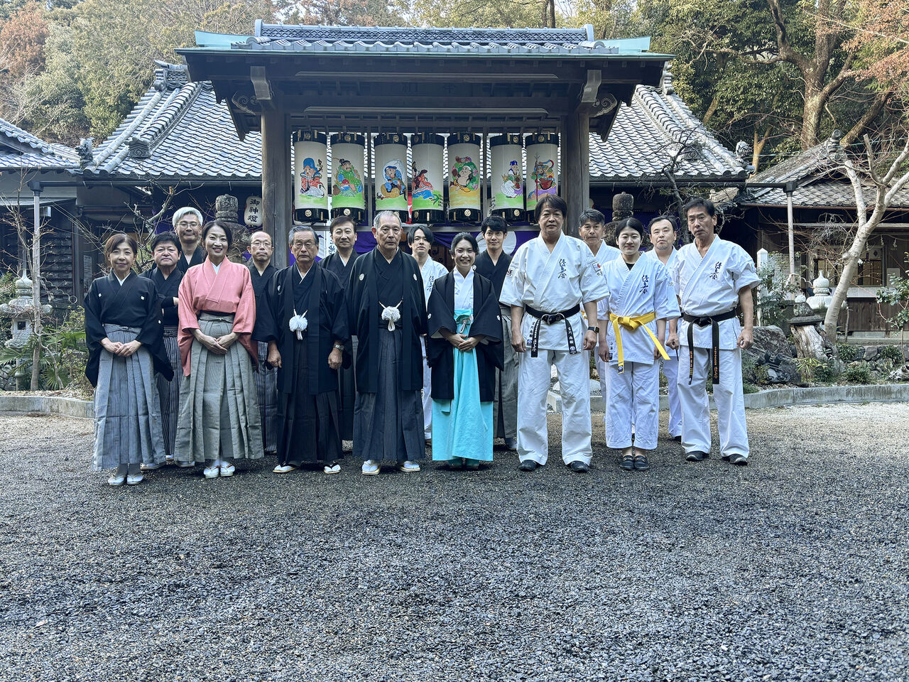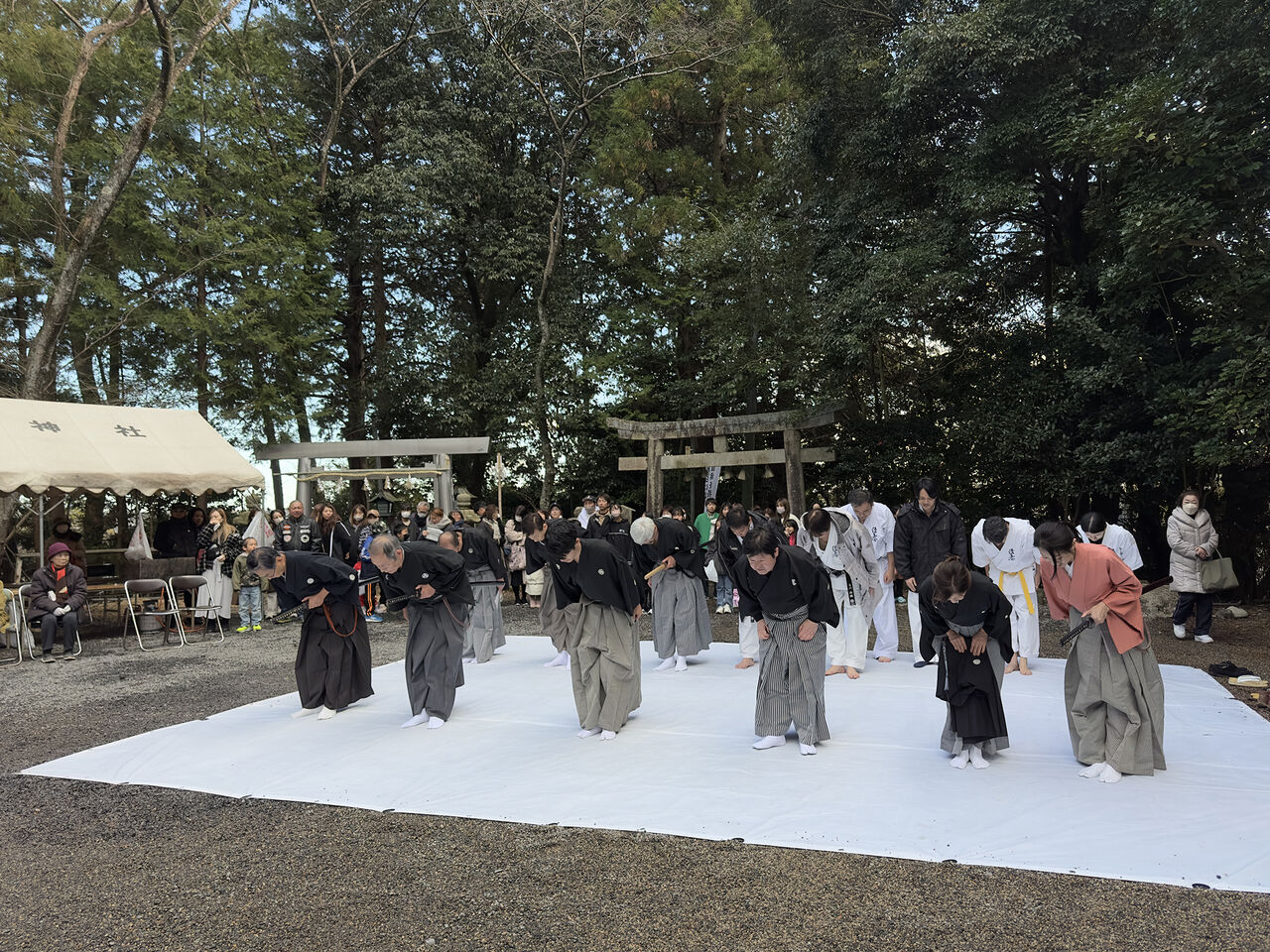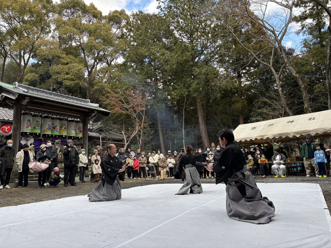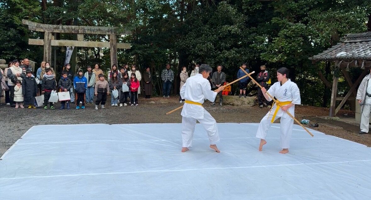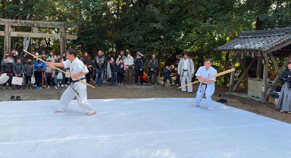 令和7年 吉田神社初午祭奉納演武会 2025年02月11日 昨年に引き続き、新年のご祈祷でお世話になっている四日市市八王子町の「吉田神社」様にて初午祭が開催され、境内で奉納演武を実施したしました。優真会古武道クラスからは、剛柔流の型と武器術、板の四方割り、古川師範の寸勁瓦割を披露。優真会会員も所属する無双直伝英信琉「三重頌風会(しょうふうかい)」からは、居合の型と太刀打ちを披露されました。つい先日積雪に見舞われたため足元の悪い中でしたが、普段の稽古の成果をご覧いただけたのではないでしょうか。お招きいただいた宮司、氏子総代の皆様、誠にありがとうございました。今後ともよろしくお願いいたします。 「活動報告」カテゴリの最新記事 < 前の記事次の記事 > コメント コメントフォーム 名前 コメント 評価する リセット リセット 顔 星 投稿する 情報を記憶